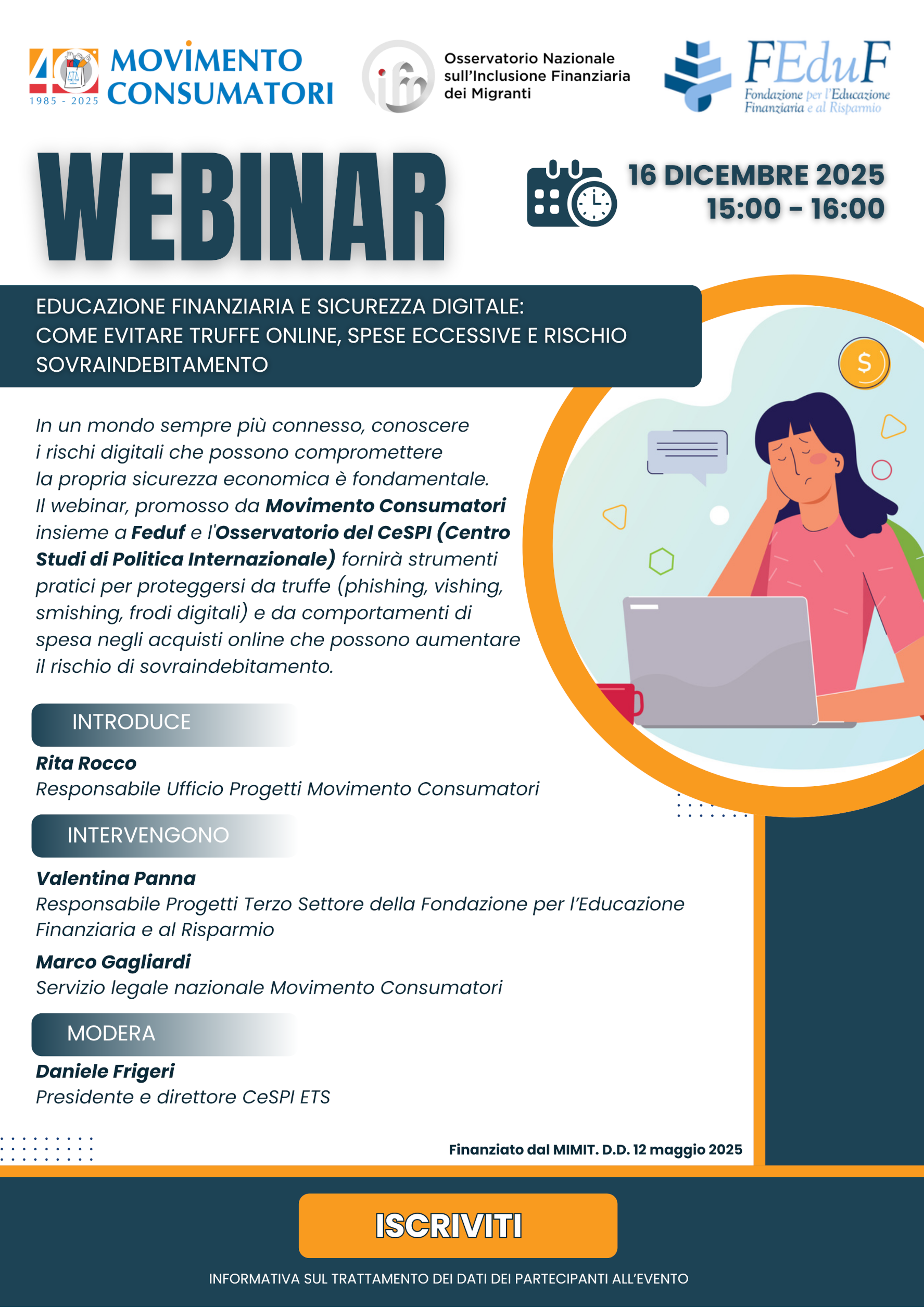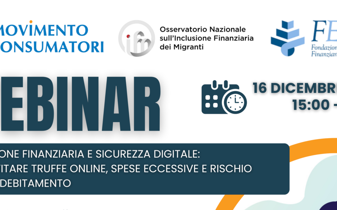 Nell’ambito del progetto “Finanza Inclusiva” e delle attività dei quattro Laboratori Territoriali dell’Osservatorio Nazionale sull’Inclusione Finanziaria dei Migranti sono stati previsti alcuni webinar su temi selezionati dagli stessi Lab.  Si tratta di incontri di formazione – informazione, momenti di approfondimento su temi connessi all’inclusione finanziaria dei cittadini stranieri.