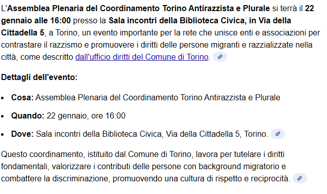 Vi comunichiamo che l’Assemblea Plenaria del Coordinamento Torino Antirazzista e Plurale si svolgerà il 22 gennaio alle ore 16.00 presso la Sala incontri della Biblioteca Civica in Via della Cittadella 5 con il seguente Ordine del giorno: