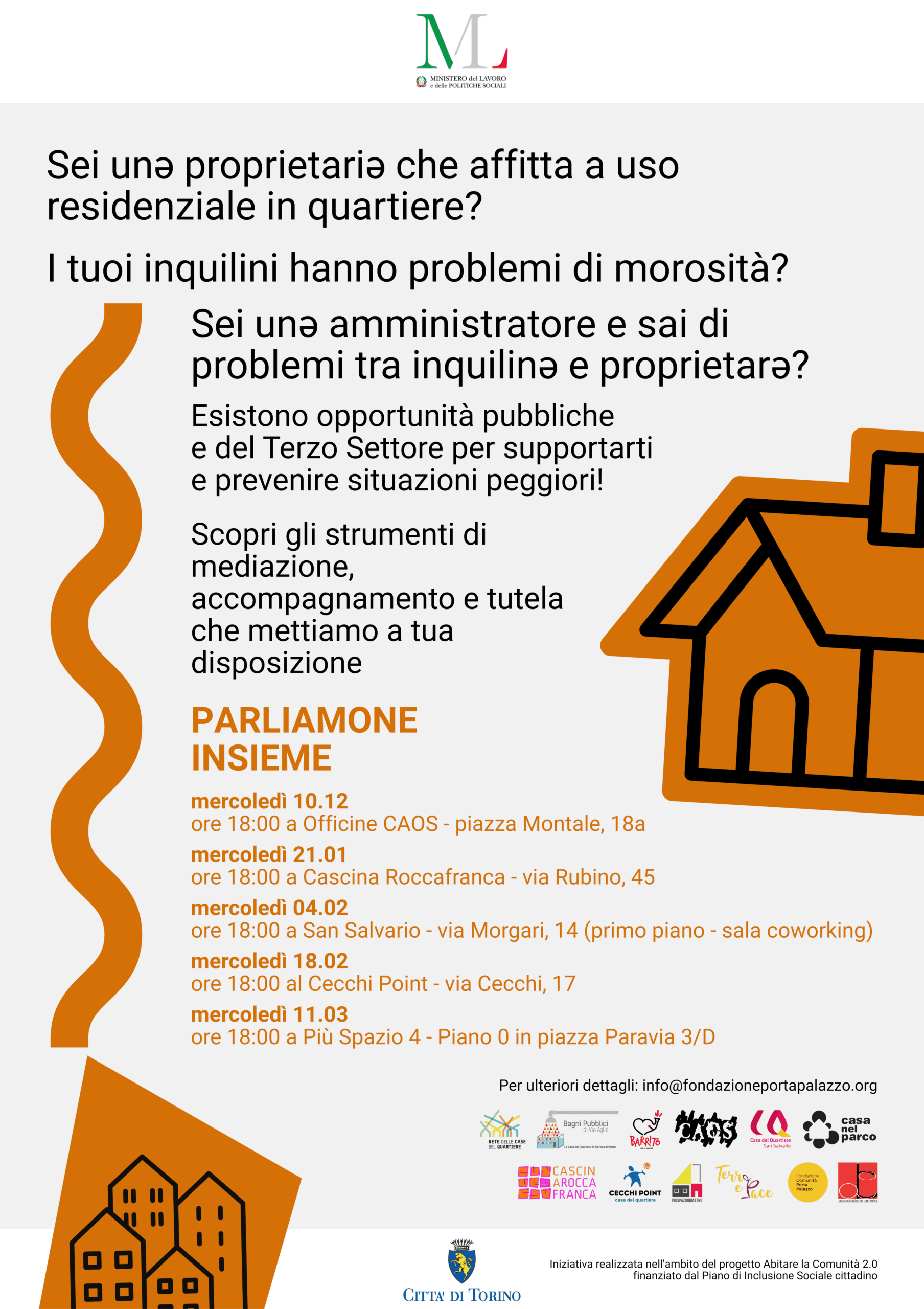 QUESTIONI DI CASA è una concreta opportunità per tutelare entrambe le parti: 5 incontri informativi gratuiti in altrettante Case del Quartiere pensati per presentare politiche pubbliche e progetti del Terzo Settore che intervengono nei casi di morosità incolpevole.