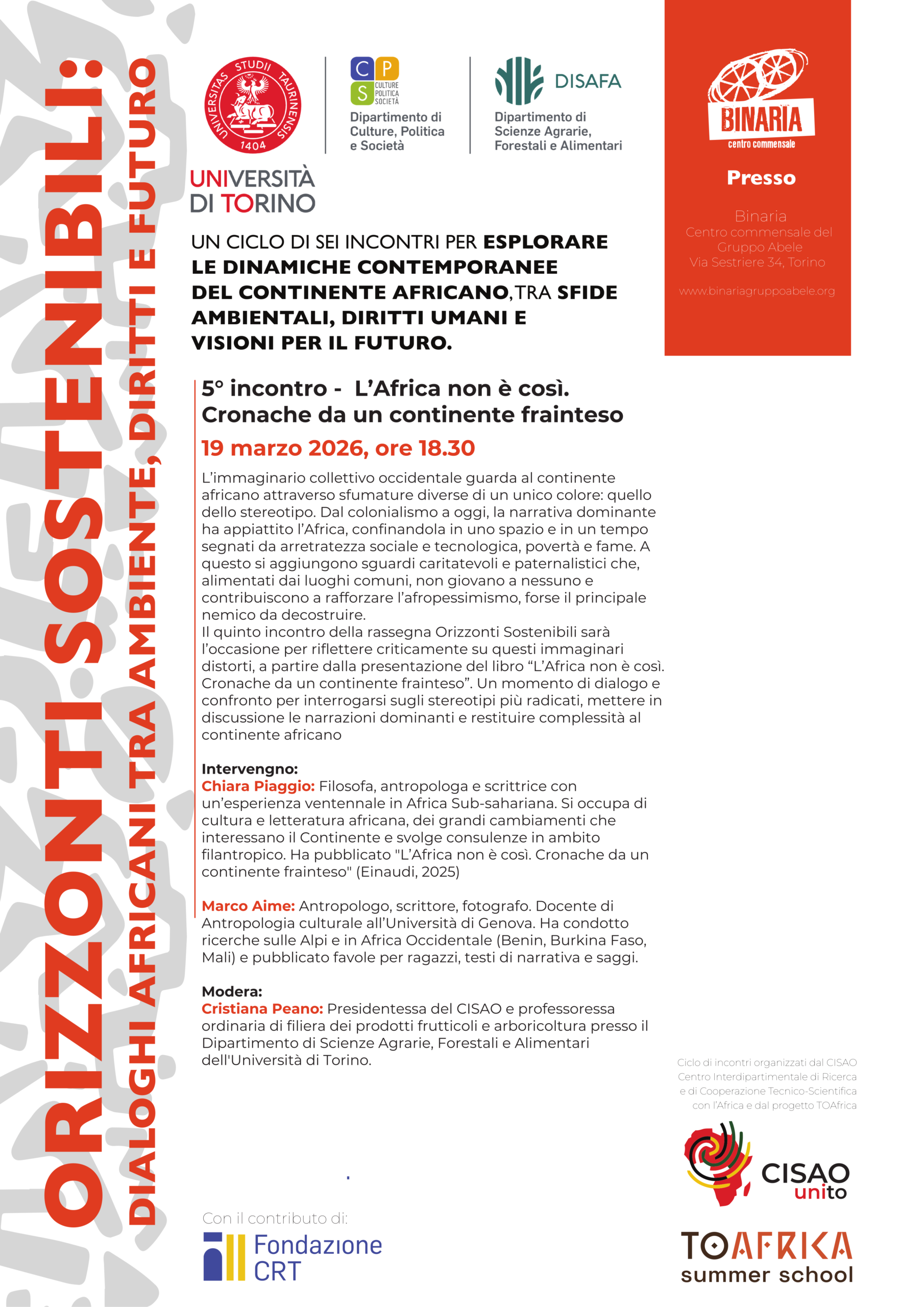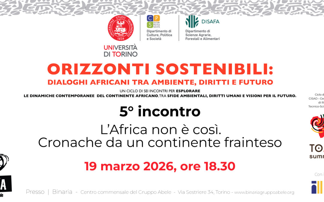 Panafricando-Aps, invitato da CISAO, in collaborazione con DISAFA, CPS e progetto TOAfrica, al quinto appuntamento dell’iniziativa “Orizzonti Sostenibili“, dal titolo “L’Africa non è così. Cronache da un continente frainteso“.